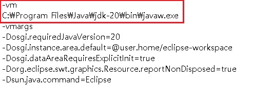 -vmargs 위에 -vm 인수를 추가하여 값을 jdk 설치위치의 경로를 추가해준다.