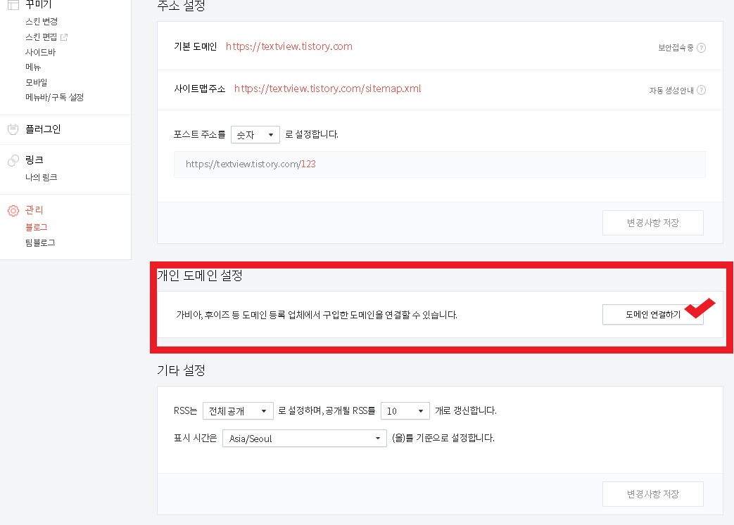 화면을 그대로 내려보면, 표시된것처럼 "개인도메인 설정" 이 보여지는데, 우측 체크표시된 "도메인 연결하기"를 클릭한다.