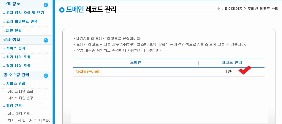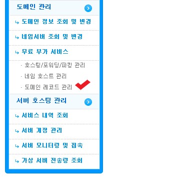 마이페이지 좌측 하단에 보면 도메인 레코드 관리가 보인다. 도메인 레코드 관리를 클릭한다.