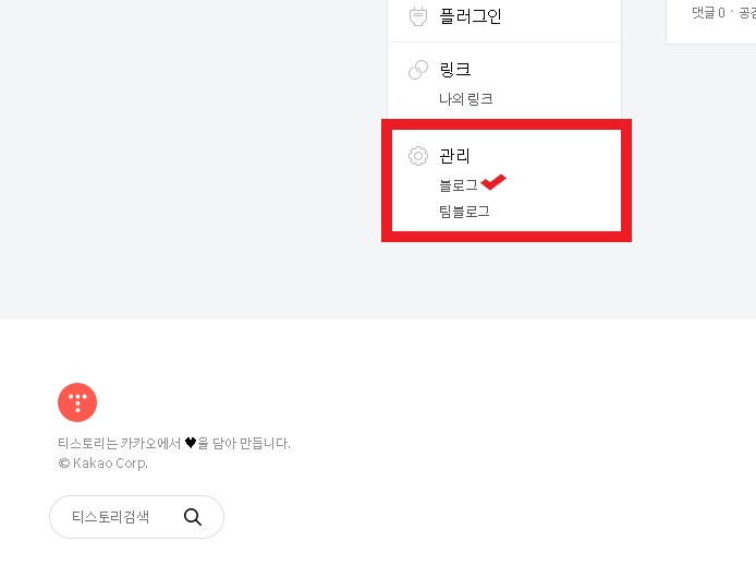먼저 티스토리 관리(어드민)를 접속 후, 좌측 하단에 이미지처럼 표시된 블로그를 클릭한다.