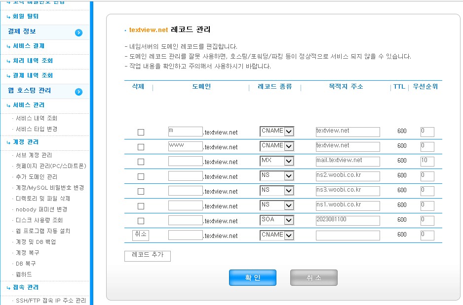blog.textview.net 으로 설정해야되서 도메인 앞 메모박스안에 blog라고 입력해주었다.(필요없으면 blog 입력안해도 된다.)