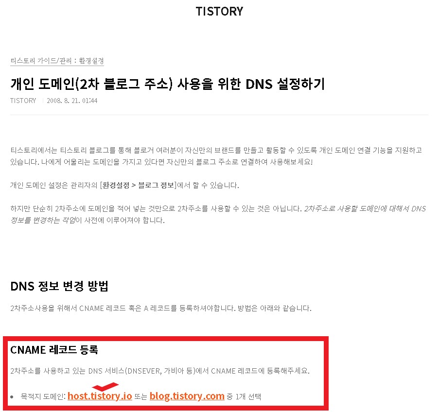아래 표시된 이미지처럼 티스토리에서는 DNS 서비스에서 CNAME 레코드, IP 등을 먼저 설정한후에 연결 해 주세요라고 안내하고 있다.